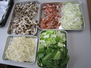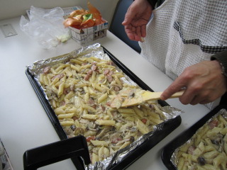 グラタンの具はペンネ・マイタケ・玉ねぎ・ソーセージ・しめじ。人数が多かったのでお皿では無く、鉄板でチーズに焼き色が付くまで焼き分けて頂きました。