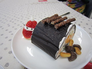 「ブッシュ・ド・ノエル」というロールケーキをデコレーションしたクリスマスケーキ♪