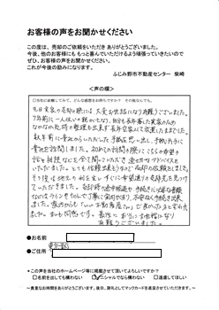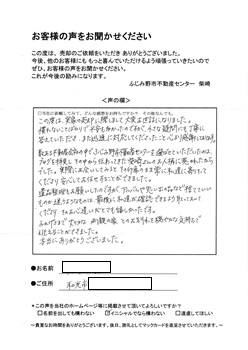 いろいろな事情も包み隠さずご説明いただき、信頼できる柴崎様にお任せして正解でした。私としては、ほとんど苦労せずにお任せして必要時に返事をするような感じでした。もし、また不動産関連の相談をする時には、ぜひ貴社にお願いしたいと考えております。本当にありがとうございました。